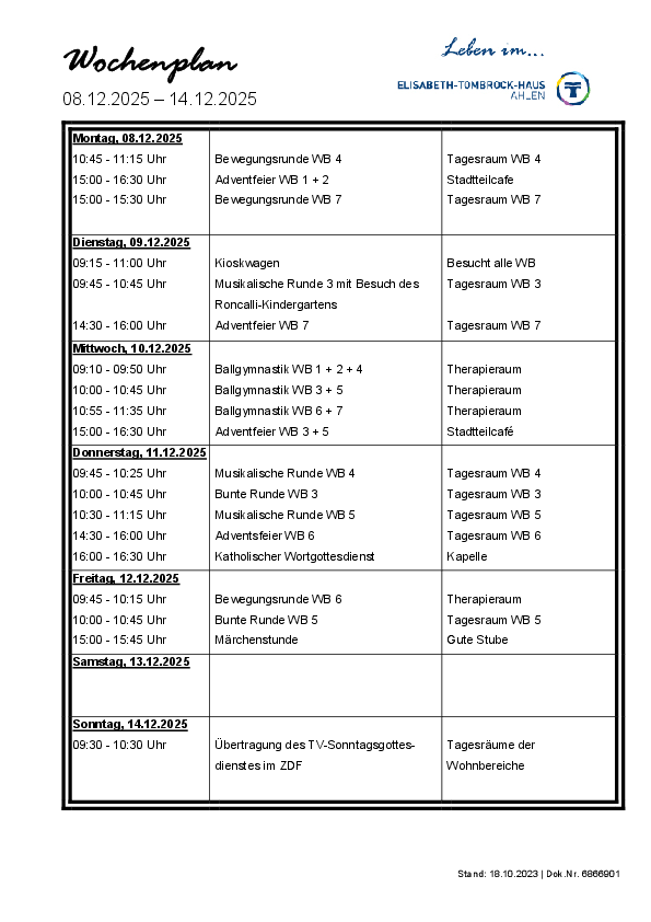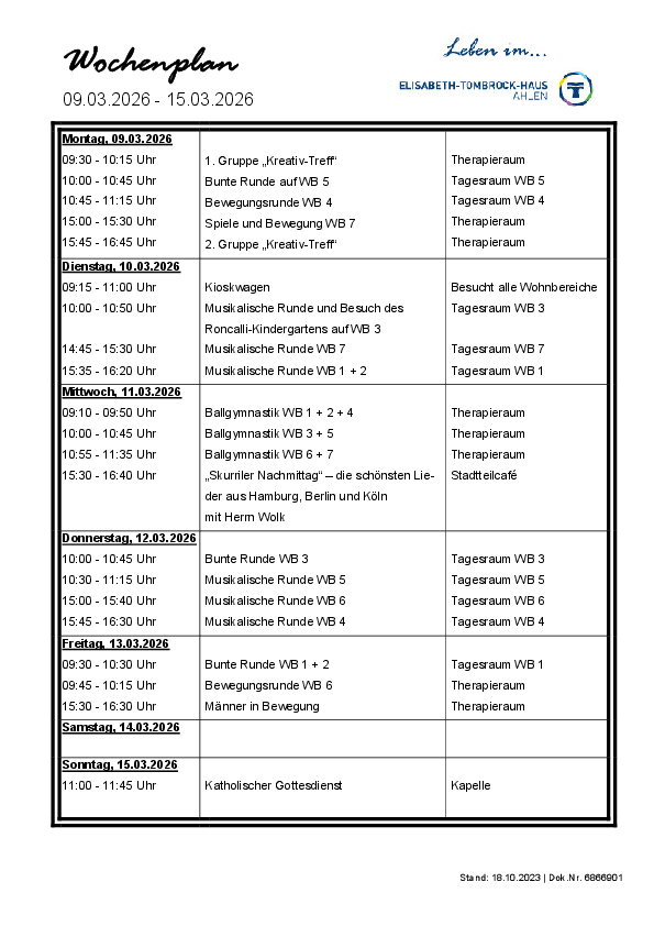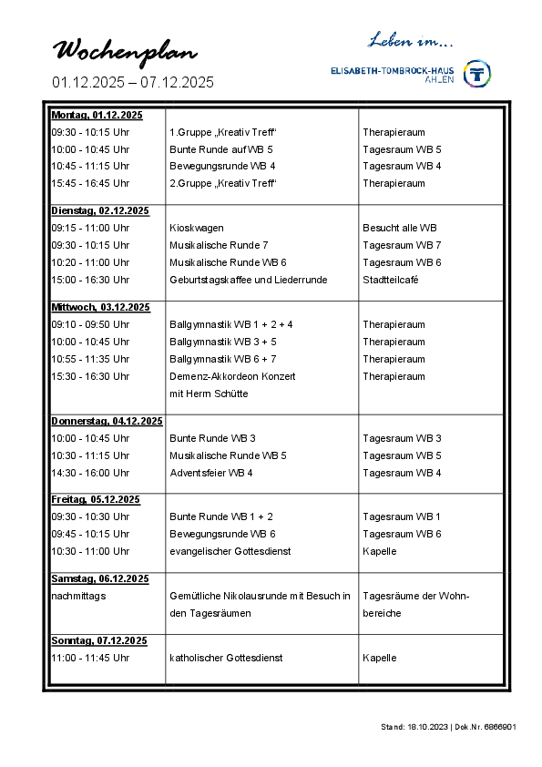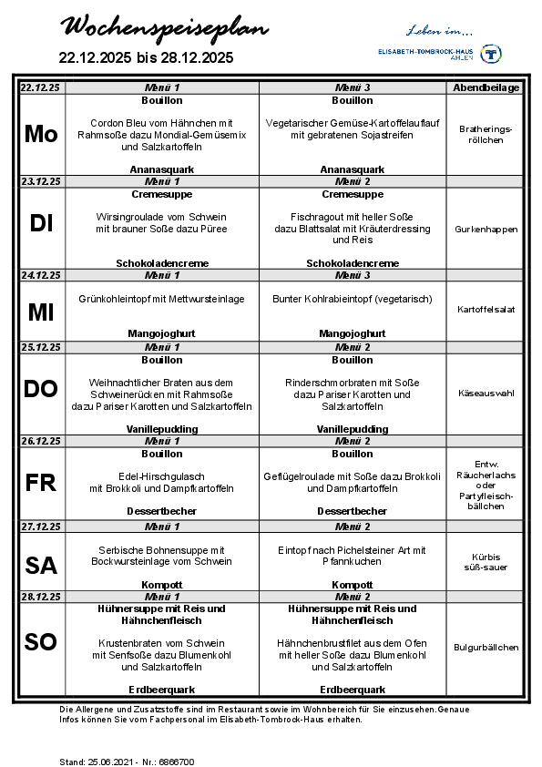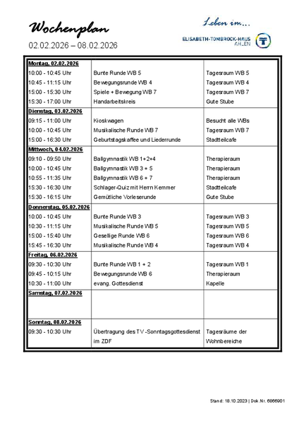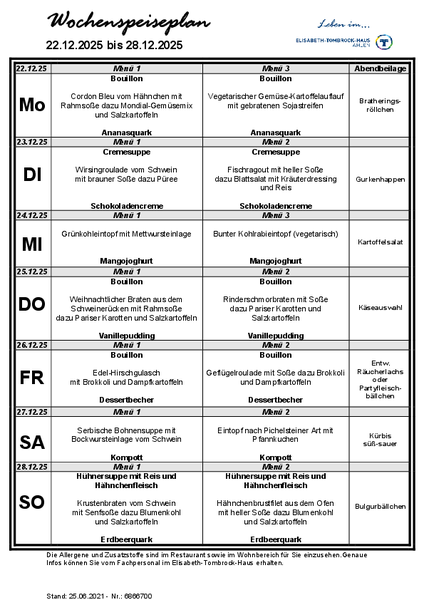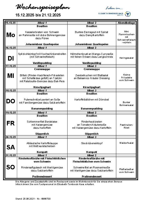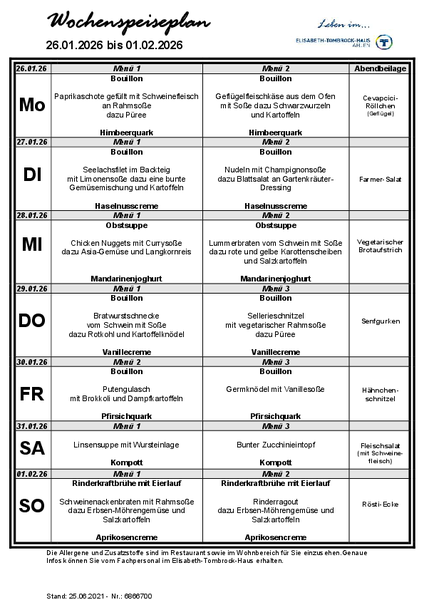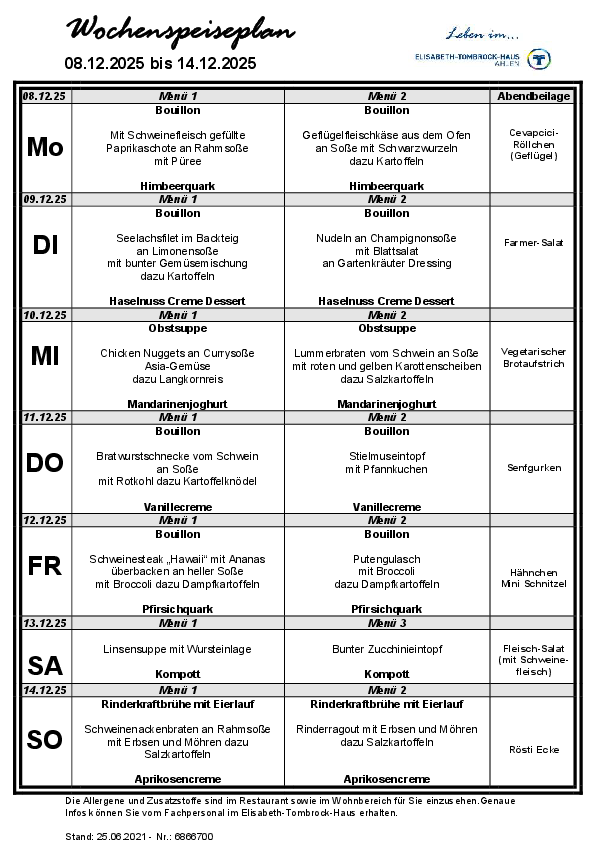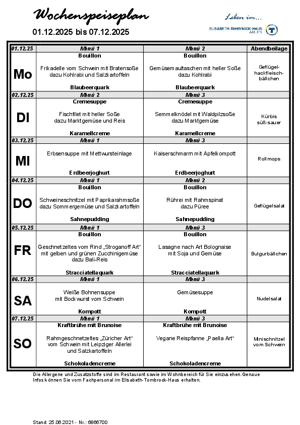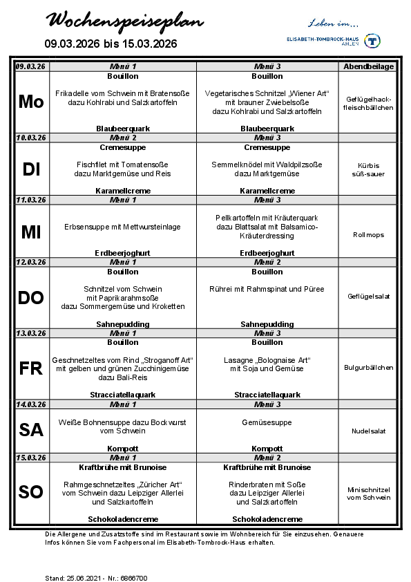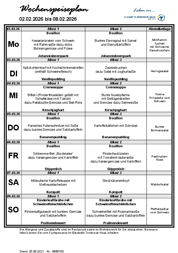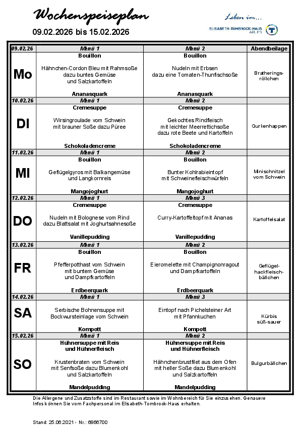 Das Elisabeth-Tombrock-Haus wird mehrmals täglich frisch von der Hauptküche des St. Rochus-Hospitals in Telgte versorgt. Täglich können die Bewohnerinnen und Bewohner aus 2 Menüs auswählen. Bei der Gestaltung eines abwechslungsreichen Speiseplanes werden individuelle Wünsche und Bedürfnisse, insbesondere tagesformabhängige Unterschiede, vegetarische Ernährungsformen sowie individuell verordnete Diäten berücksichtigt. Der Speiseplan steht in gut lesbarer Schrift, barrierefrei, ausgehängt bzw. als Handzettel wöchentlich zur Verfügung