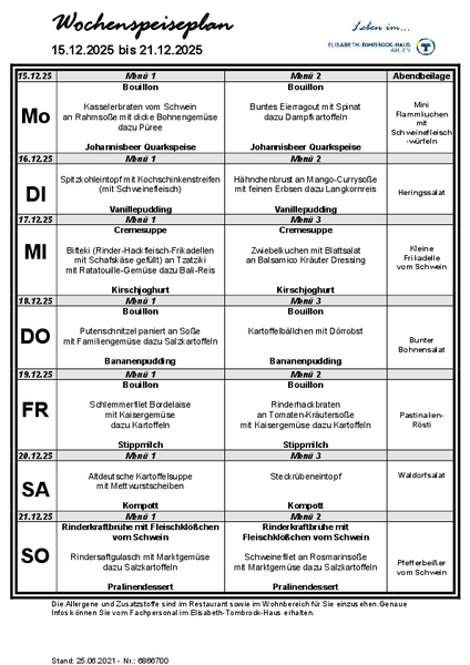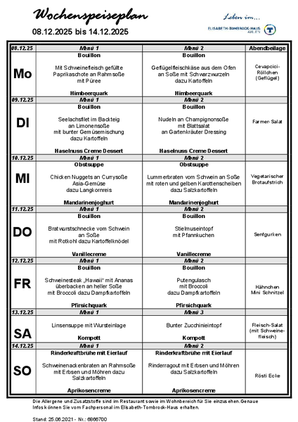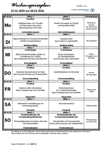 Mittags ab 12:30 Uhr bieten wir Angehörigen und Besuchern die Möglichkeit im Stadtteilcafé, nach vorheriger Anmeldung am Empfang, das Tagesmenü zu sich zu nehmen.