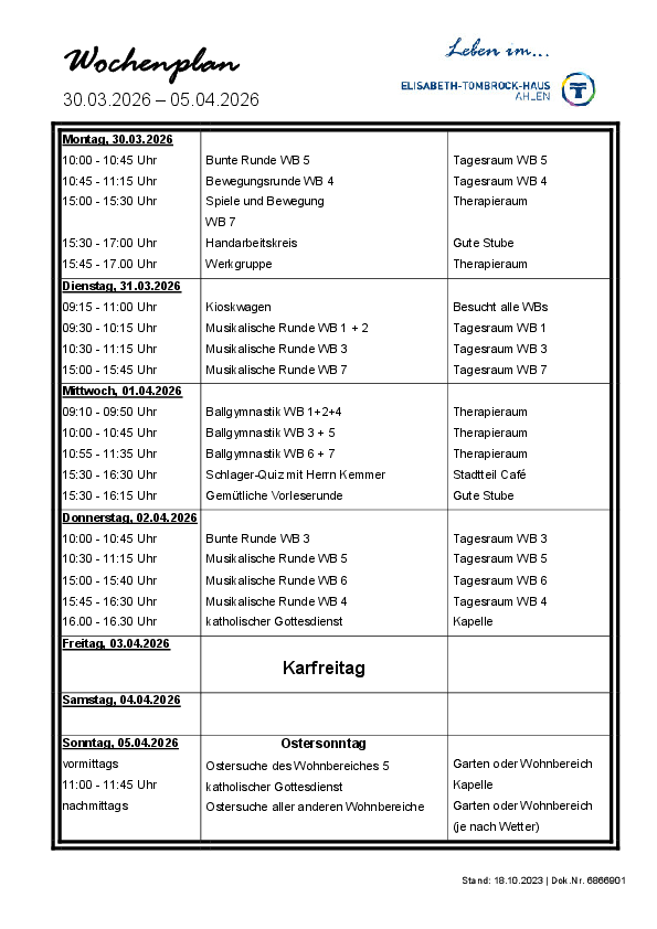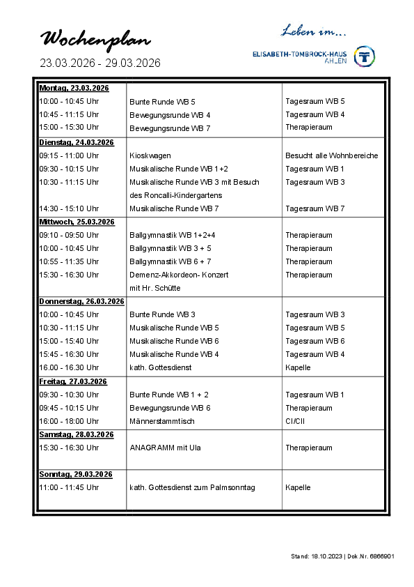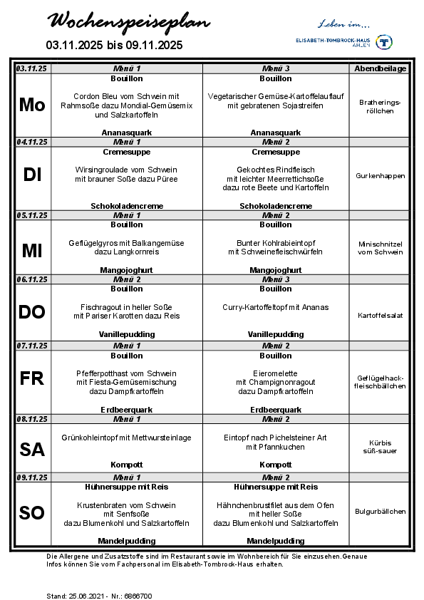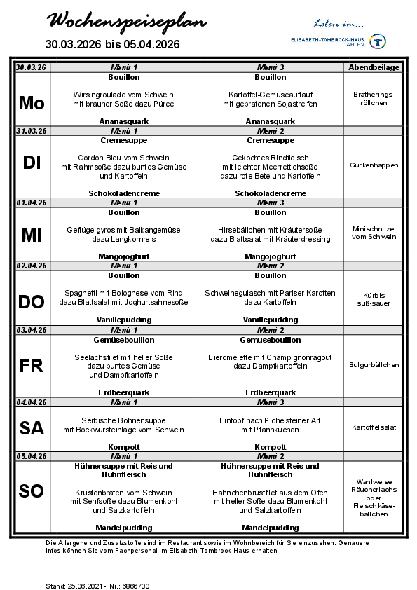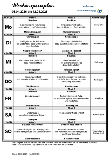Das Elisabeth-Tombrock-Haus wird mehrmals täglich frisch von der Hauptküche des St. Rochus-Hospitals in Telgte versorgt. Täglich können die Bewohnerinnen und Bewohner aus 2 Menüs auswählen. Bei der Gestaltung eines abwechslungsreichen Speiseplanes werden individuelle Wünsche und Bedürfnisse, insbesondere tagesformabhängige Unterschiede, vegetarische Ernährungsformen sowie individuell verordnete Diäten berücksichtigt. Der Speiseplan steht in gut lesbarer Schrift, barrierefrei, ausgehängt bzw. als Handzettel wöchentlich zur Verfügung