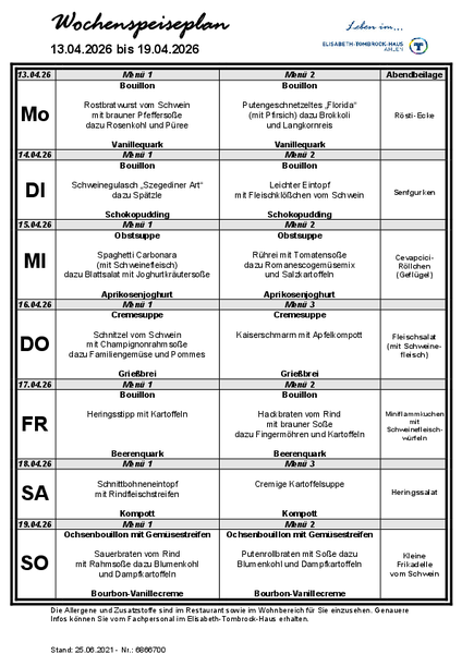 Mittags ab 12:30 Uhr bieten wir Angehörigen und Besuchern die Möglichkeit im Stadtteilcafé, nach vorheriger Anmeldung am Empfang, das Tagesmenü zu sich zu nehmen.