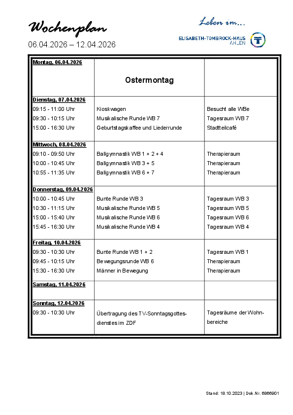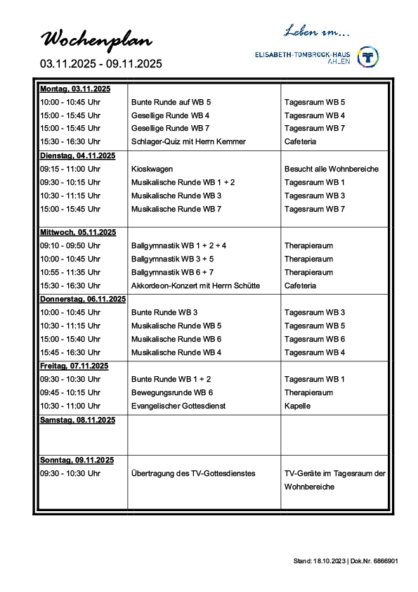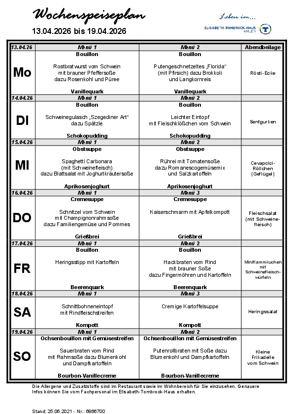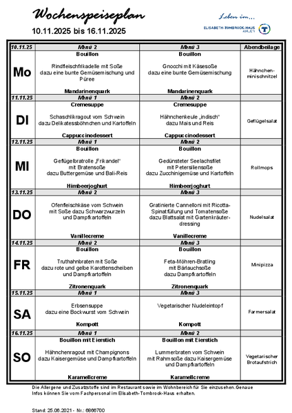 Das Elisabeth-Tombrock-Haus wird mehrmals täglich frisch von der Hauptküche des St. Rochus-Hospitals in Telgte versorgt. Täglich können die Bewohnerinnen und Bewohner aus 2 Menüs auswählen. Bei der Gestaltung eines abwechslungsreichen Speiseplanes werden individuelle Wünsche und Bedürfnisse, insbesondere tagesformabhängige Unterschiede, vegetarische Ernährungsformen sowie individuell verordnete Diäten berücksichtigt. Der Speiseplan steht in gut lesbarer Schrift, barrierefrei, ausgehängt bzw. als Handzettel wöchentlich zur Verfügung